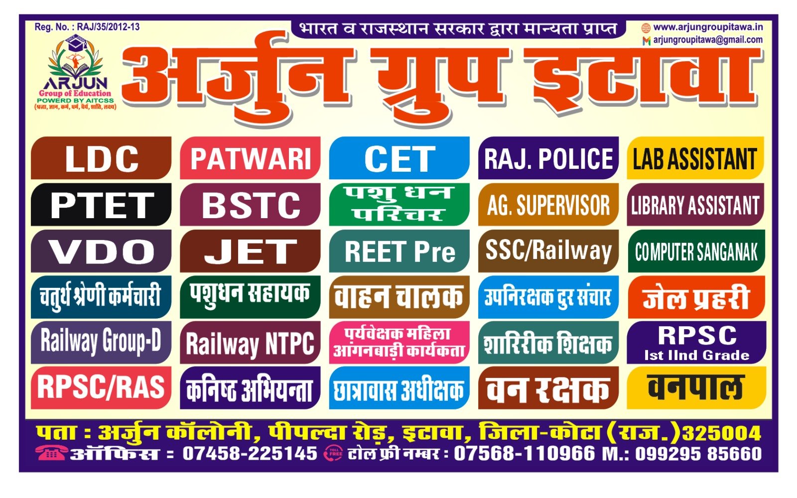 Regards PRADEEP SUMAN CHAIRMAN Arjun Group Of Education Arjun Colony Pipalda Road Itawa Distic Kota State Rajasthan 325004 TOLLFREE 07568110966 OFFICE 07458225145 MOB 09929585660 WEBSITE:arjungroupitawa.in EMAIL: arjungroupitawa@gmail.com