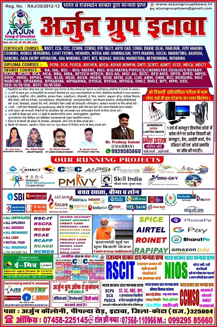 LAST DATE FOR APPLY 30/07/2026 Admission open: RSCIT ECCE DCA PGDCA MDCA MDCTT CCC CCA CCMSO CNTT DNTT ADNTT DYOGA BYOGA MYOGA BA MA BSc MSc BCom MCom BCA MCA BBA MBA STC BEd MEd BTech MTech BLib MLib BSW MSW DPharma BPharma MPharma LabTechnician Dped Bped Mped LLB BVoc MVoc BSc Agri MSC Agri ANM GNM BSc Nursing MSC Nursing BGEN MGEN Regards PRADEEP SUMAN CHAIRMAN Arjun Group Of Education Arjun Colony Pipalda Road Itawa Distic Kota State Rajasthan 325004 TOLLFREE 07568110966 OFFICE 07458225145 MOB 09929585660 WEBSITE:arjungroupitawa.in EMAIL: arjungroupitawa@gmail.com